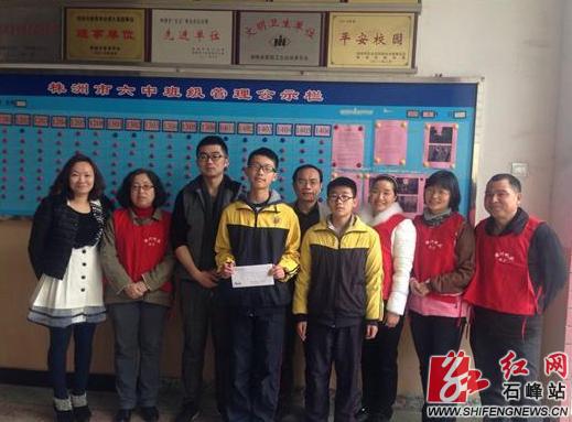 石峰新闻网讯 学雷锋日已过,但雷锋精神仍在延续。3月9日上午,株洲晚报王永恒、彭芳、刘晓燕、李青、仇凤英5名义工(“萤火虫公益助学行动”成员)来到株洲市六中,为易家伟(化名)和尹文韬(化名)两位贫困学生带来社会爱心人士胡峥和邱林的爱心捐款。
