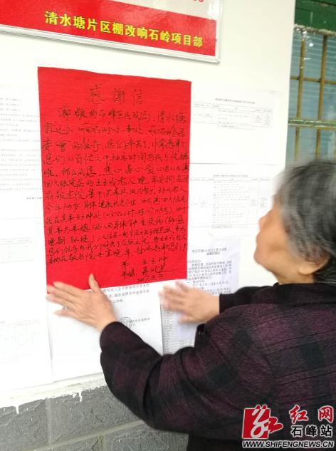 石峰新闻网讯(通讯员 蒋霞霞)3月4日上午,响石三村棚改项目组的墙上一张大红感谢信映入眼帘。原来这是三无老人王玉成的弟弟、弟媳感谢响石岭街道办事处和石峰区民政局、清水塘拆迁办多次协商后将其哥哥安排至敬老院安享晚年。