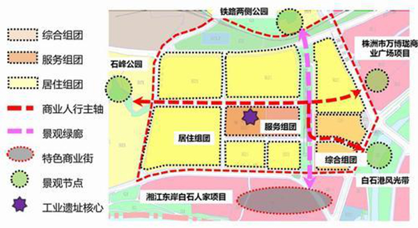 两心,形成以万博珑商业广场为主的商业中心和以工业遗址改造为核心的生活服务中心。