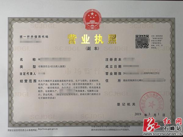 石峰新闻网讯(通讯员 叶文)3月1日上午,石峰区政务服务中心工商窗口发出首张新版营业执照。